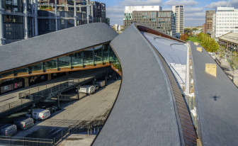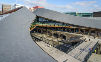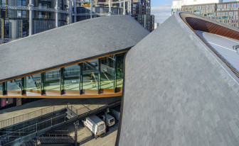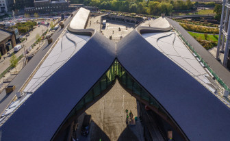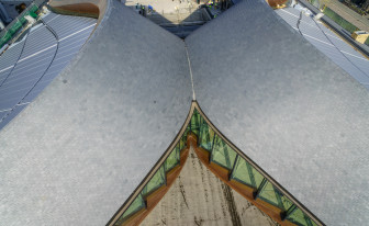 The completed building now showcases a magnificent sweeping Welsh slate-covered roof structure, that joins the two original buildings together with a kissing point.